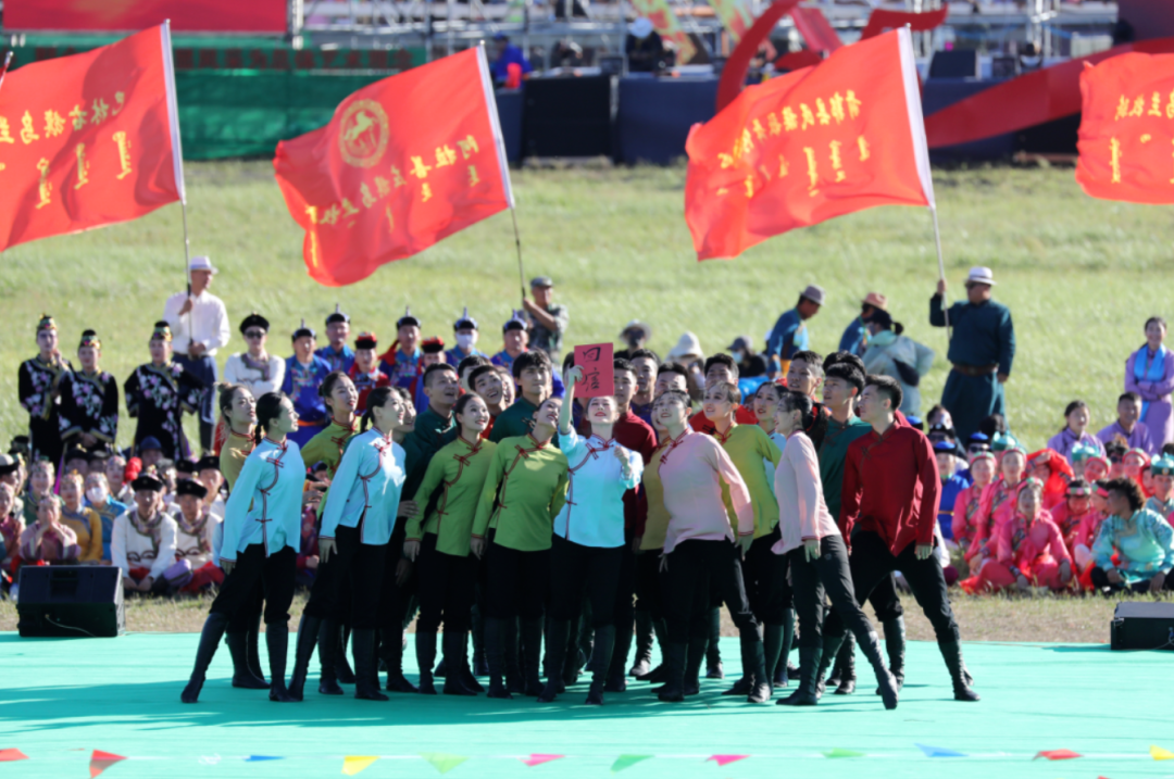 56个民族华裳铺就“民族团结通道”,24名骑警擎国旗踏歌而来,“北疆”“京蒙”彩车以流动的画卷诉说时代交响,劳模方阵高歌《我们走在大路上》传递奋斗荣光,各旗县代表队舞动地域风情, 《山水盟约》铺展壮美画卷,《你和我》唱响青春律动,《礼赞》《绿色兴安》《神奇草原》歌声舞步汇成欢乐海洋,万人安代舞《为内蒙古喝彩》红绸翻飞点燃会场。