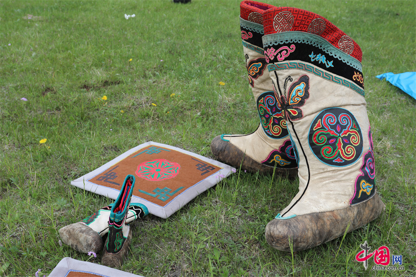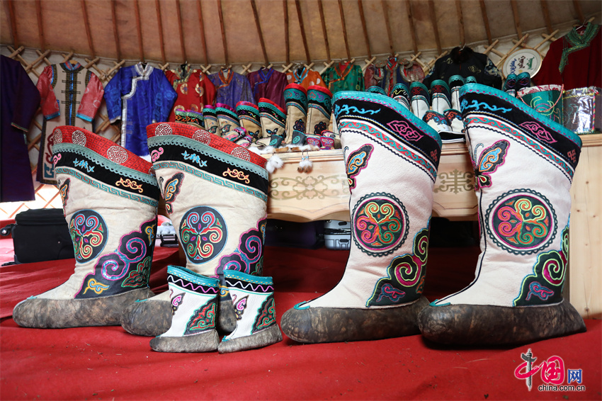 对于当地人来说,索海靴不仅是服饰,更是民族情感和文化传承的重要载体。数百年来,人们围绕索海靴创作了诸多传说、民歌,巴尔虎短调民歌《达岭图热易台固图勒》中唱到“索海固图勒的布靴筒上,缝饰了双层八副图案,缝饰的那双层八副图案,是那达日玛姑娘的手艺”,表达了人们对索海靴的喜爱和赞美。