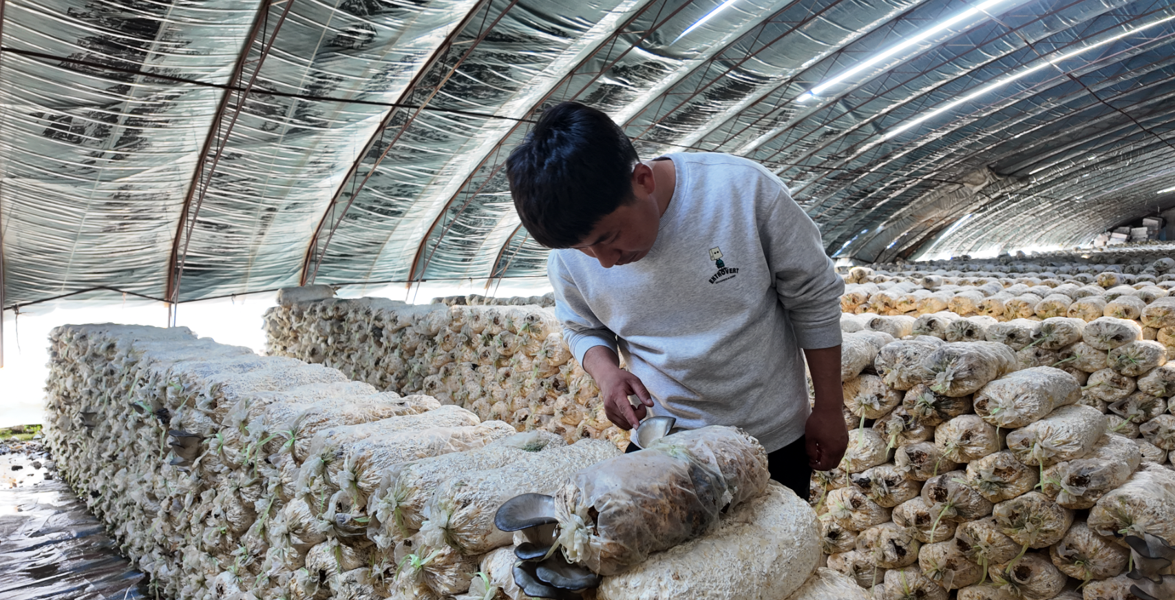 董永强在大棚查看平菇生长情况