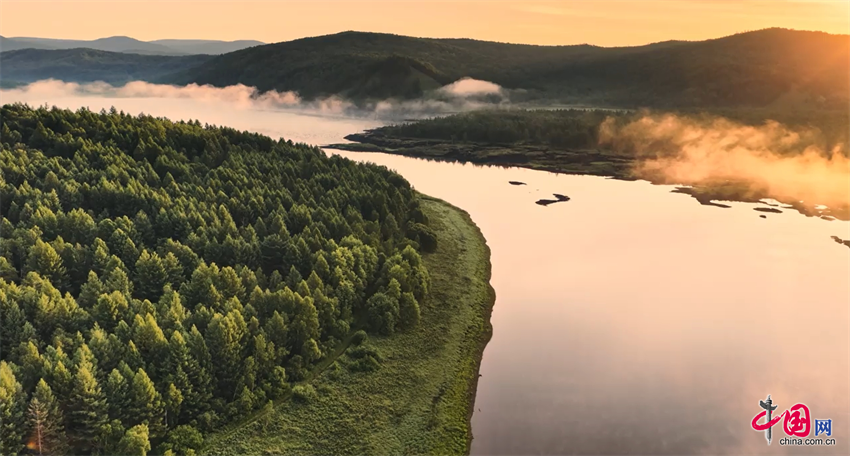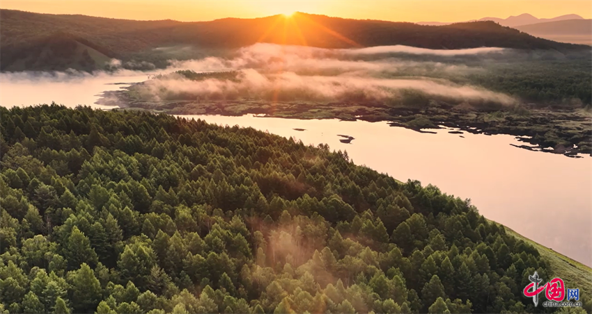 晨光初露时,内蒙古兴安盟阿尔山仙鹤湖畔的朝霞将天空染成一片梦幻的粉红色。