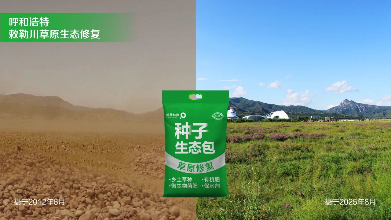 从沙地治理首选草种蒙农1号蒙古冰草,到退化草地生态修复中最有效的草种巴尔虎羊草,再到高寒生态修复先锋三河偃麦草,蒙草以培育及转化的105个国产草种新品种为核心,科学配比包衣材料、微生物菌肥、保水剂等新材料,研发种子包等“一地一方”定制化创新产品,应用于草原修复、沙地治理、盐碱地改良等,从源头上保障了低耗、高效、节约的生态修复。