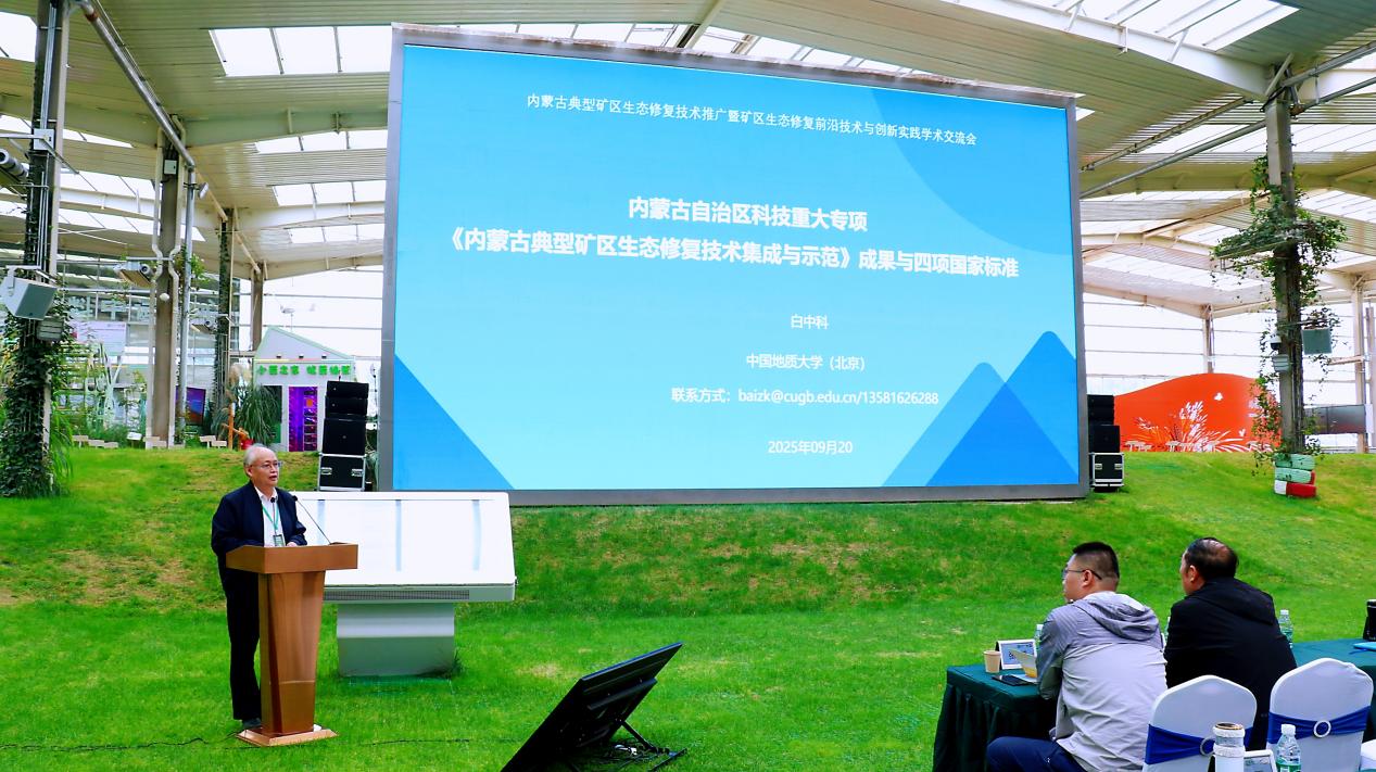 会上,中国地质大学白中科教授作为项目课题组代表进行报告。课题依托种质资源库和生态大数据平台,形成了多项新技术、新工艺和新标准,为矿山治理提供了科学依据和技术支撑。